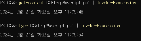 두 번째 방식은 "type", "Get-Content"와 같은 명령어로 파일을 읽어오고, 파이프라인을 이용하여 powershell의 인자로 넘겨주어 실행하는 방식이다.